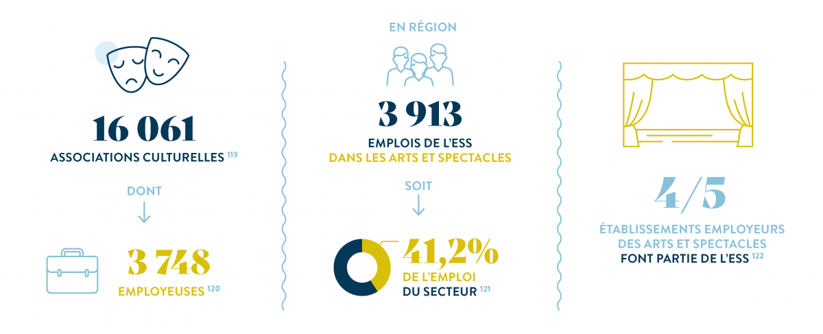 L’ESS se trouve être un pilier du champ culturel. Les associations sont en effet les premières employeuses du spectacle vivant (musique, théâtre, danse, etc.) et salarient chaque année plusieurs milliers d’intermittents, appuyées par l’association régionale Auvergne-Rhône-Alpes Spectacle Vivant. L’ESS comprend également de très nombreuses radios associatives, cinémathèques, librairies coopératives, magazines et journaux indépendants, maisons d’édition, musées et organisations de préservation du patrimoine culturel et associations d’artistes plasticiens.